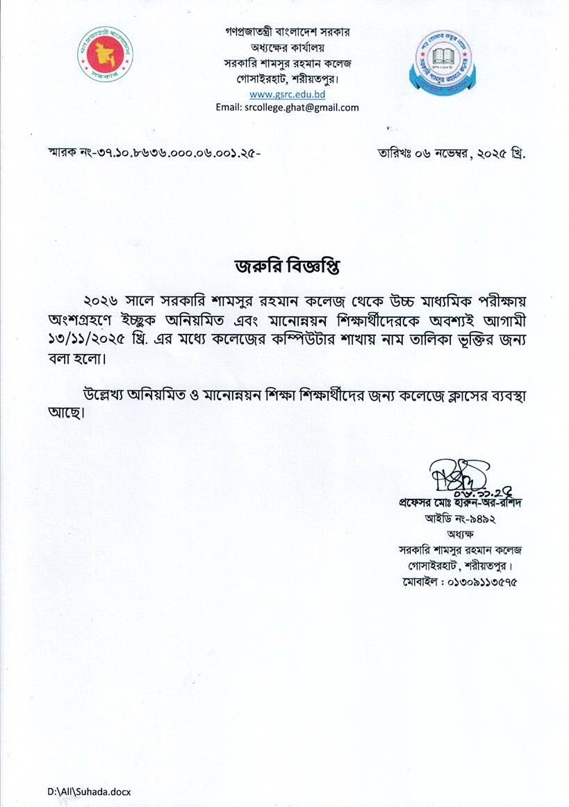 ২০২৬ সালের উচ্চ মাধ্যমিক সার্টিফিকেট পরীক্ষায় অংশগ্রহণ সংক্রান্ত জরুরি বিজ্ঞপ্তি.....