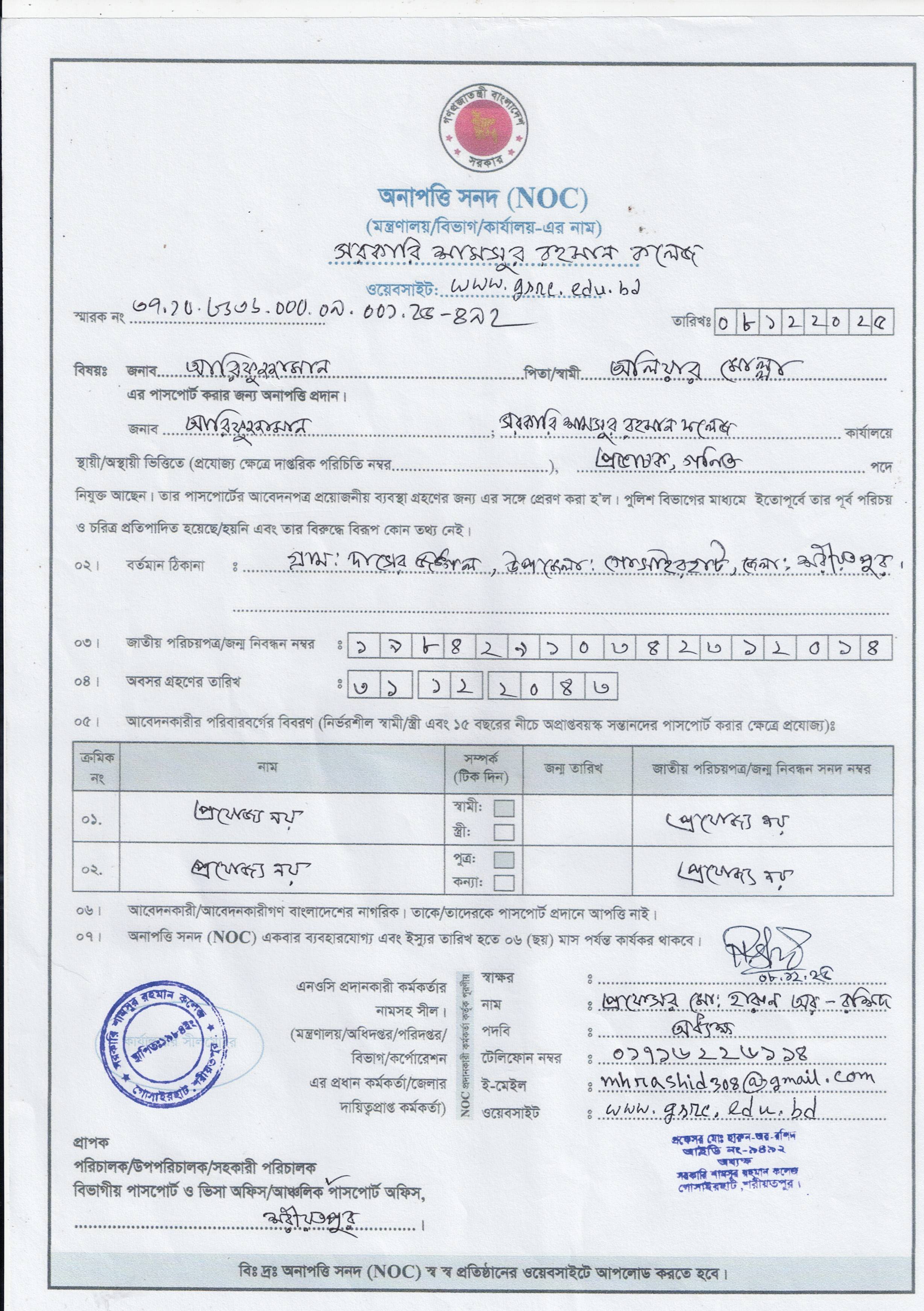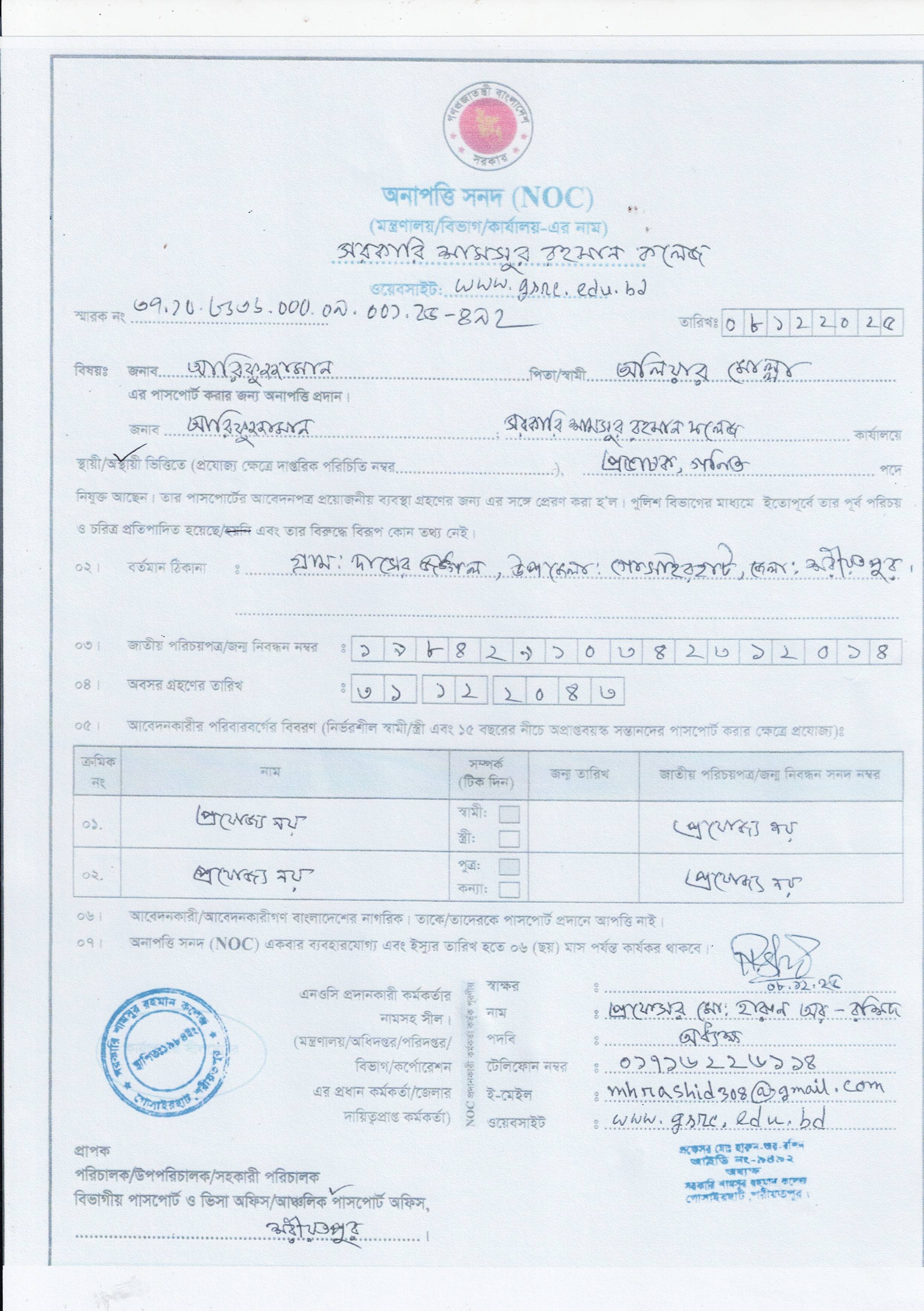 জনাব আরিফুজ্জামান, প্রভাষক, গণিত এর অনাপত্তি সনদ (NOC) |