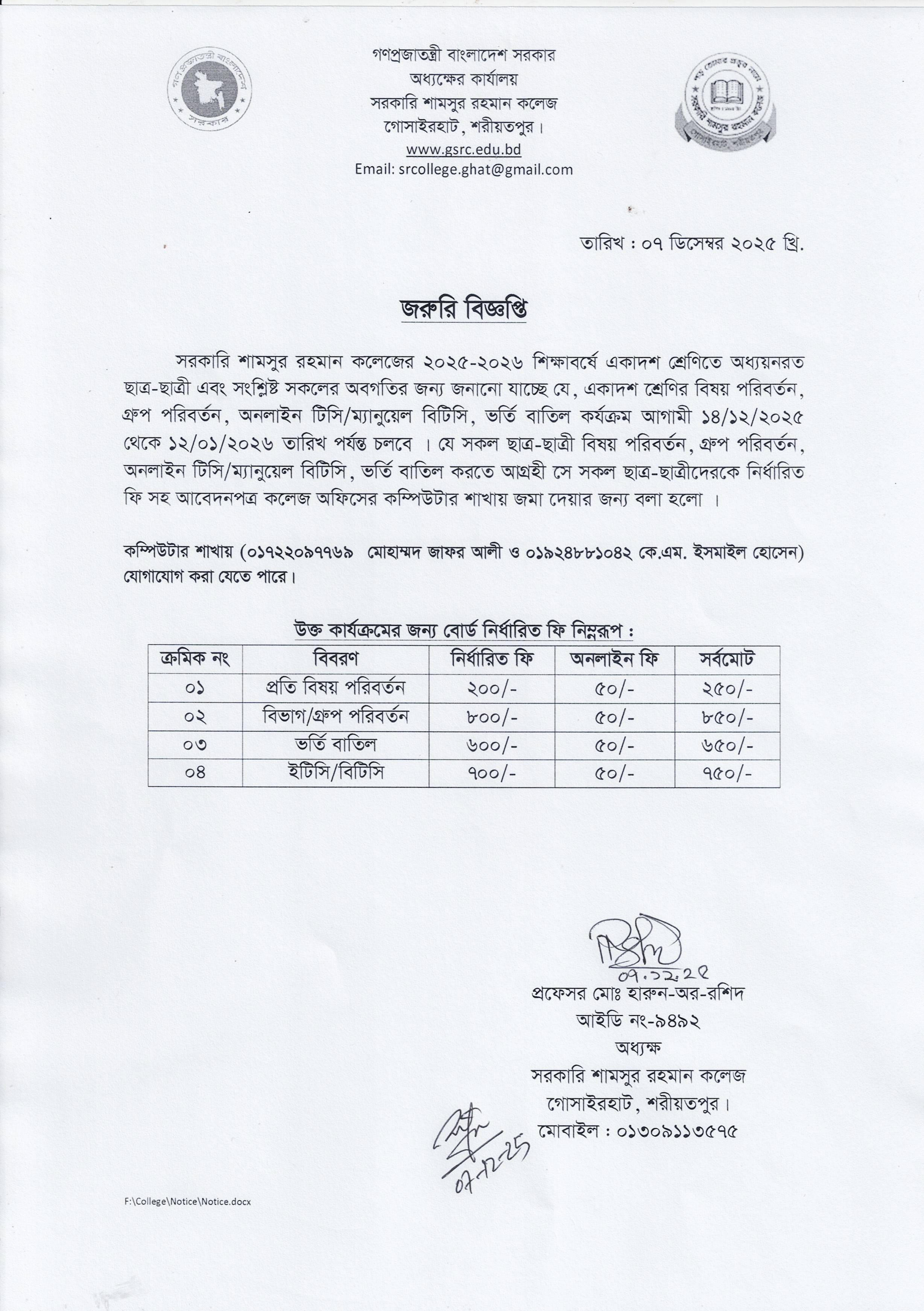জরুরী বিজ্ঞপ্তি (একাদশ শ্রেণির বিষয়, গ্রুপ ও টিসি সংক্রান্ত) |