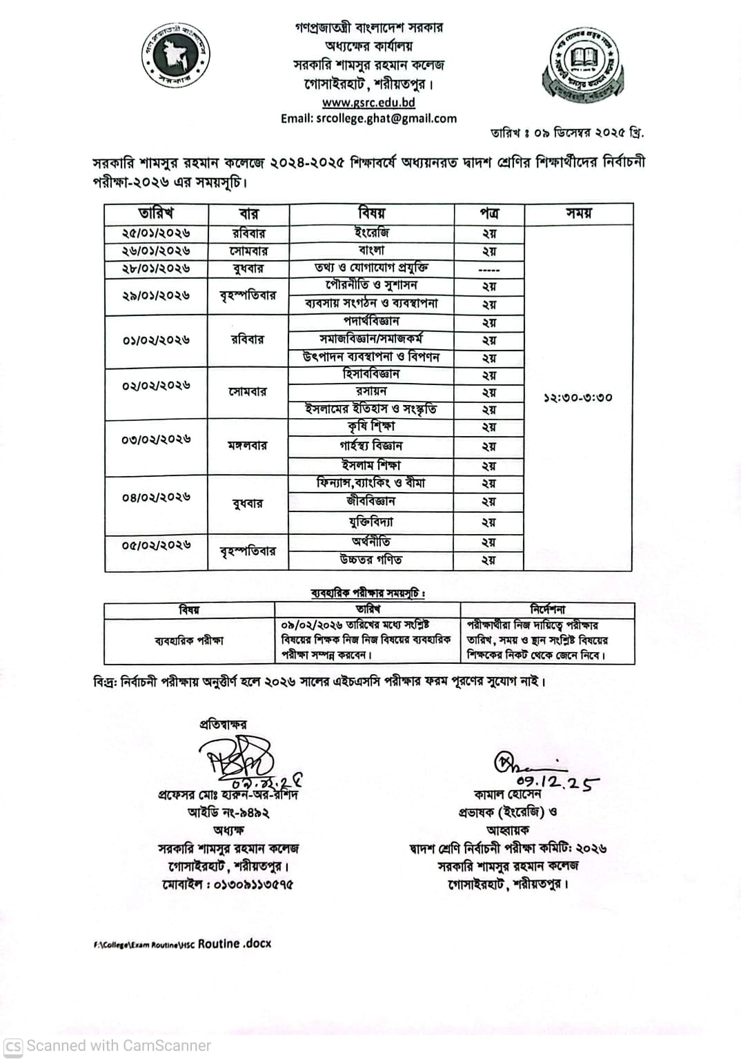 দ্বাদশ শ্রেণির নির্বাচনী পরীক্ষা-২০২৬ এর সময়সূচি। |