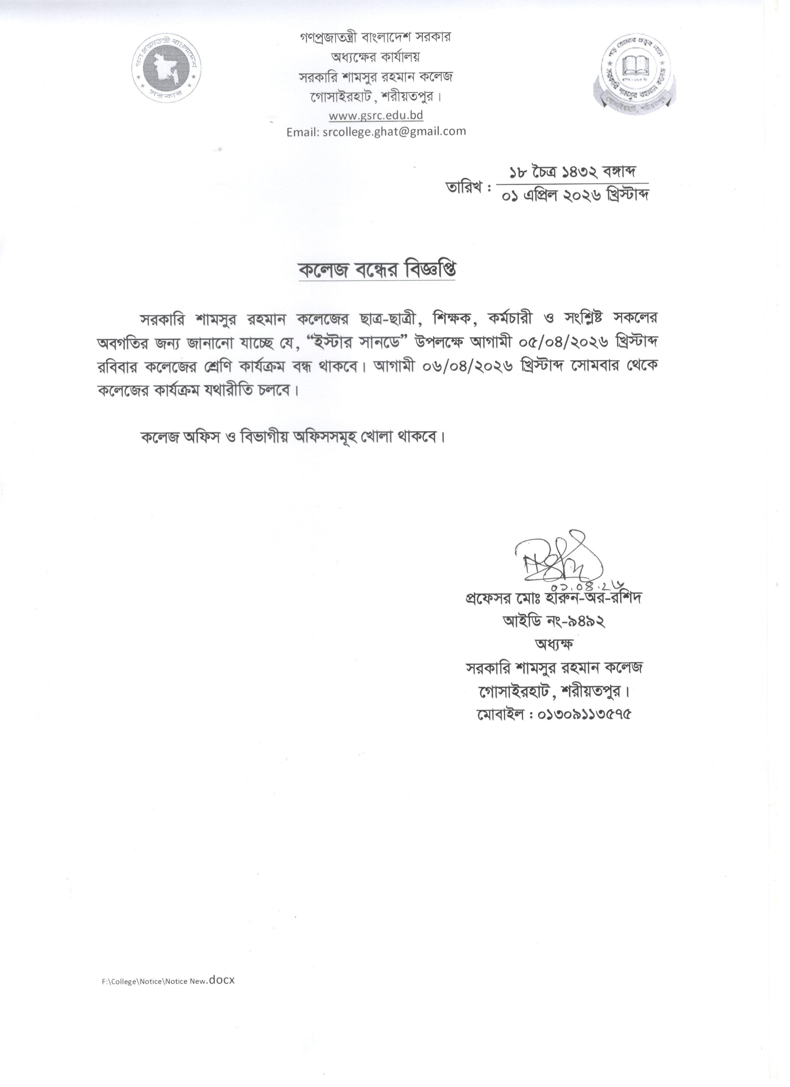 কলেজ বন্ধের বিজ্ঞপ্তি |